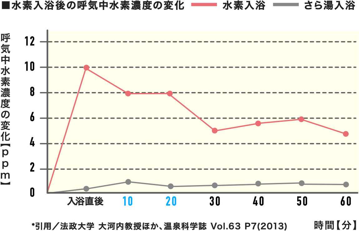 入浴後、5~10分程度で水素が全身に巡り始めます。さら湯に比べて呼気中の水素濃度が有意に増加しており、全身の隅々まで水素で満たされた状態になります。