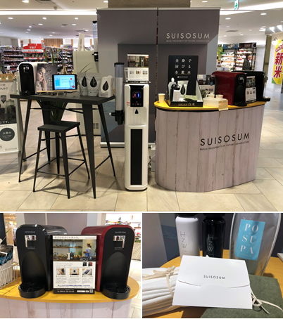 AQUなどの製品展示をはじめ、水素水の試飲と白水(25g)のサンプリングを行い、たくさんの方々にスイソサムの製品を知っていただくことができました。